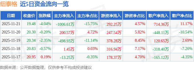 九游娱乐唯一网站:股票行情快报:纽泰格(301229)11月21日主力资金净卖出100661万元